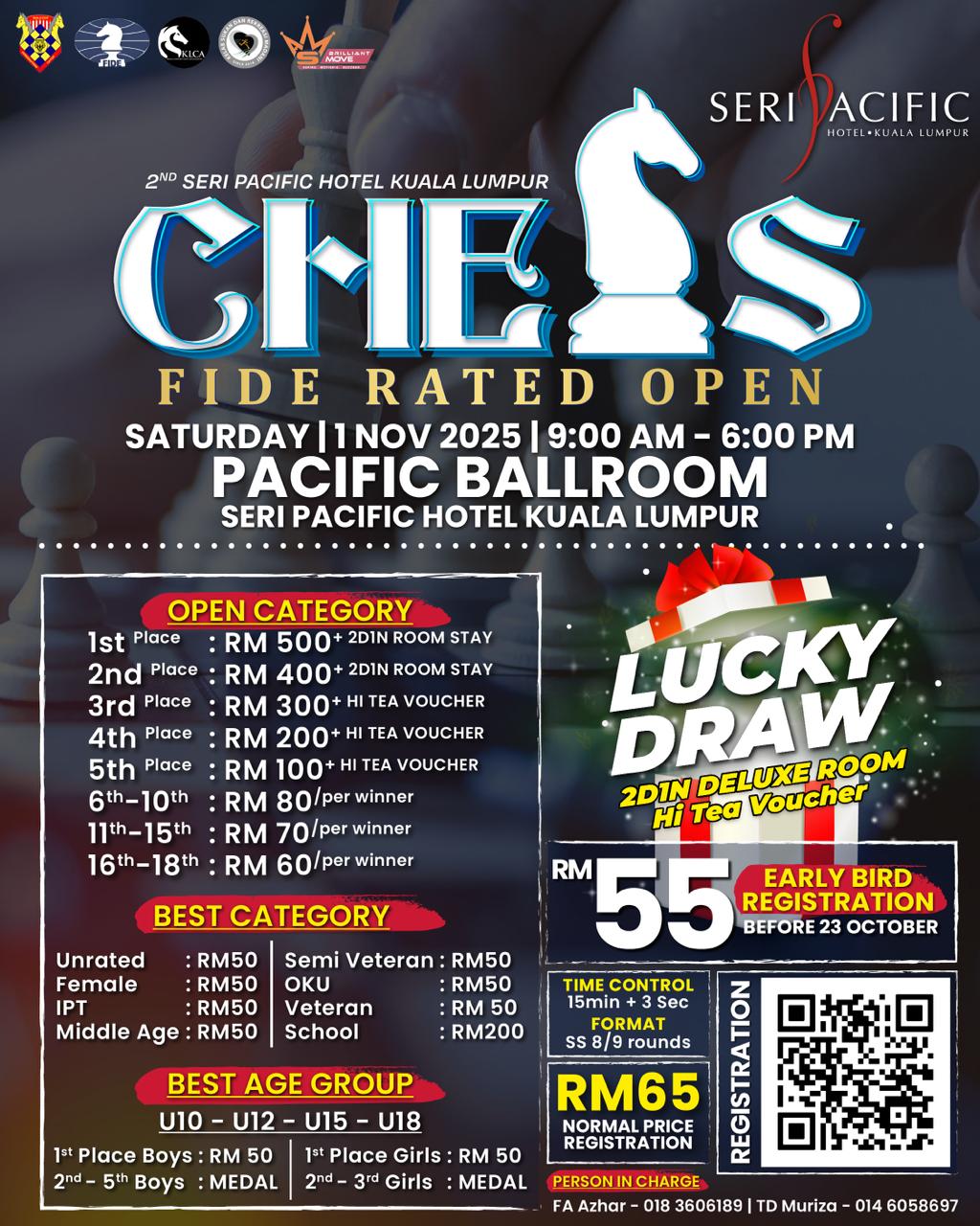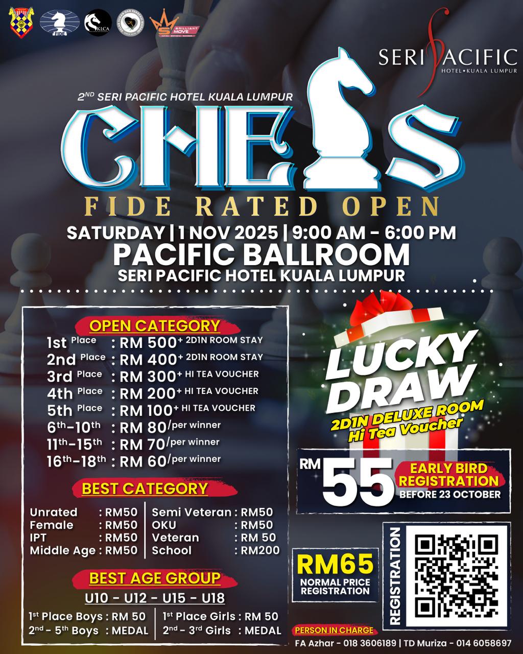 | 2 | Seri Pacific FIDE Rated Open | 9 Feb | FIDE Rapid | ![]() | Venue: Seri Pacific Hotel Enquiries : 018-3606189 (Azhar) / 014-6058697 (Muriza) Registration: https://tinyurl.com/SPHKL25 |